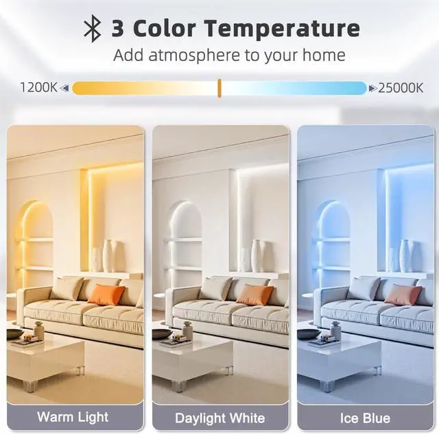 Full-Spectrum Color Temperature: Preset 3 commonly used color temperatures: daylight white warm yellow and ice blueand supports an ultra-wide range adjustment from 1800K to 25000Kfar exceeding competitors' limited range of only white 2700K-6500K. Use daylight white to awaken vitality in the morning. At night adjust warm light to create a cozy atmosphere; and switch to ice blue can liven up the party. One-click matching your mood and scene requirements at every moment.