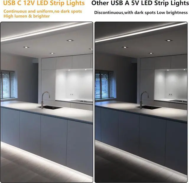 ?? POWERFUL 12V USB-CExperience superior 12V brightness via a modern Type-C interface. Strictly requires a 20W or higher PD power source to light up; standard 5V USB ports will not work.?? VERSATILE HOME AMBIANCEPerfect 6000K Cool White glow for kitchen cabinets TV backlights and vanity mirrors. Provides a cozy consistent atmosphere across the entire 16.4 ft length.??? PEEL-AND-STICK SETUPFeatures an upgraded industrial-strength adhesive backing for zero-tool installation. Mounts securely to wood metal and plastic surfaces in seconds.?? FLEXIBLE DIY DESIGNEngineered with a highly flexible copper base that bends easily around 90-degree corners.