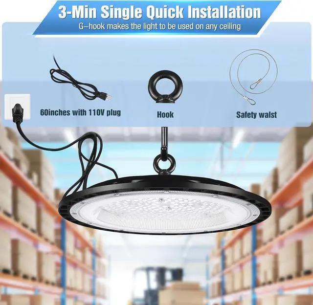 Quick Installation: Follow our installation guide this high bay light can be installed easily and quickly. Providing a US plug with 5ft power cord makes it easy quick and safe installation. Also there is an additional protection safety rope to keep it more stable on the ceiling. 100% environmentally-friendly 100% safe and easy to installUpgrade