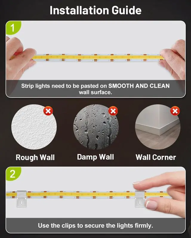 & Easy Installation]: This COB strip light can be cut at 0.98 in (25mm) intervals to fit your needs. It includes double-sided adhesive tape and clips for easy installation on clean smooth surfaces ensuring a secure fit. Ideal for kitchens closets under cabinets bedrooms TV backlighting stairs corridors dressing tables makeup mirrors bookshelves wine racks and more.