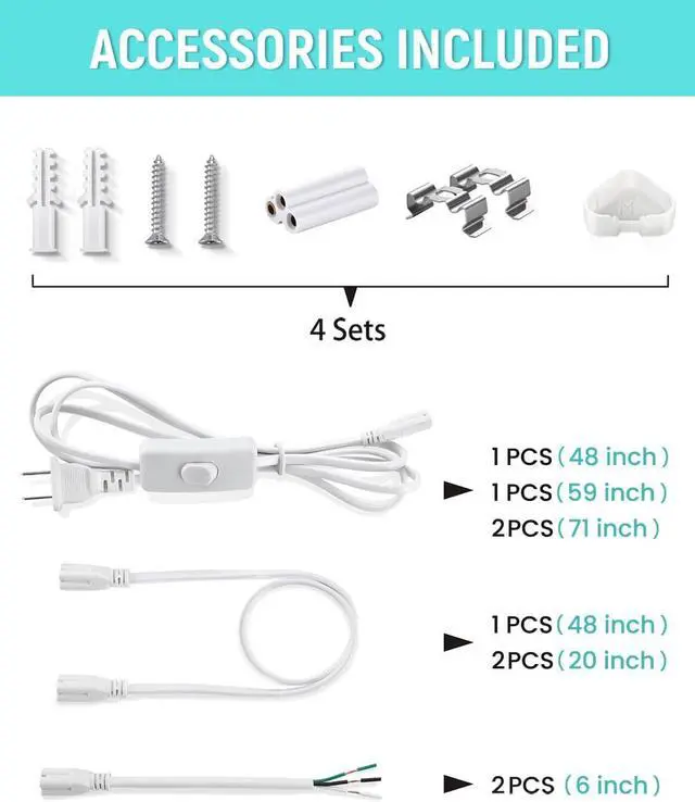 Installation]: LED garage lights with a complete kit of mounting accessory include screws and mounting clips for fixing the light safely. LED lights come with 59/48/71 inch power cord and 20/48 inch connection cable for you to hang on the ceiling or installing on the wall; Equipped with upgraded three-wire plug for avoiding the risk of electric shock the lights ensure safety use[Multiple