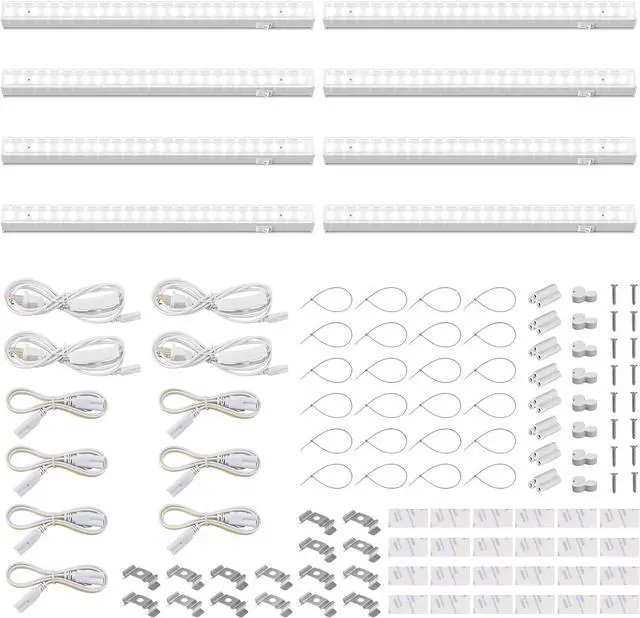 You Get: 8 x Barrina T5 Grow Lights 4 x Power Cords with ON/OFF Switch 7 x Connecting Cords( 39.37 '') 8 x Small Connectors 16 x Installation Clips 24 x Double-sided Tapes 24 x Cable Ties