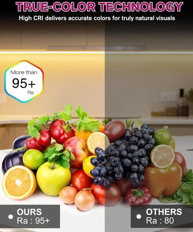 Professional quality LED strip lights require a professional DC 24 Volt power supply (sold separately). These strips are installed in a wide variety of applications including General accent lighting Under cabinet lighting Above cabinet lighting Toe kick lighting Shelving lighting Back lighting Bathroom and bedroom lighting Ambient lighting Cove lighting Awning and eave lighting Bar and restaurant lighting Pathway lighting Hotel lighting. The higher the display index Ra>95+ R9>75+ the better the color rendering of the light source the stronger the ability to restore the color of the object so the higher the color rendering the less likely it is to damage eyesight.