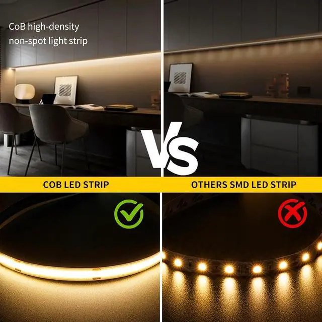 1. Ultra-high brightness high CRI Experience the extraordinary lighting experience brought by our high-density COB LED light strip! Unlike traditional SMD 2835 or 5050 LED light strips our spotless COB LED light strip integrates multiple chips on a single circuit board (PCB) providing ultra-uniform lighting without dark spots. 1600 LEDs are integrated on the 5-meter long COB LED light strip and the light-emitting units are arranged more closely than ever before creating a seamless and bright COB LED light strip effect. The high color rendering index COB LED light strip (CRI>90) ensures natural color reproduction closer to daylight soft and comfortable suitable for any environment.