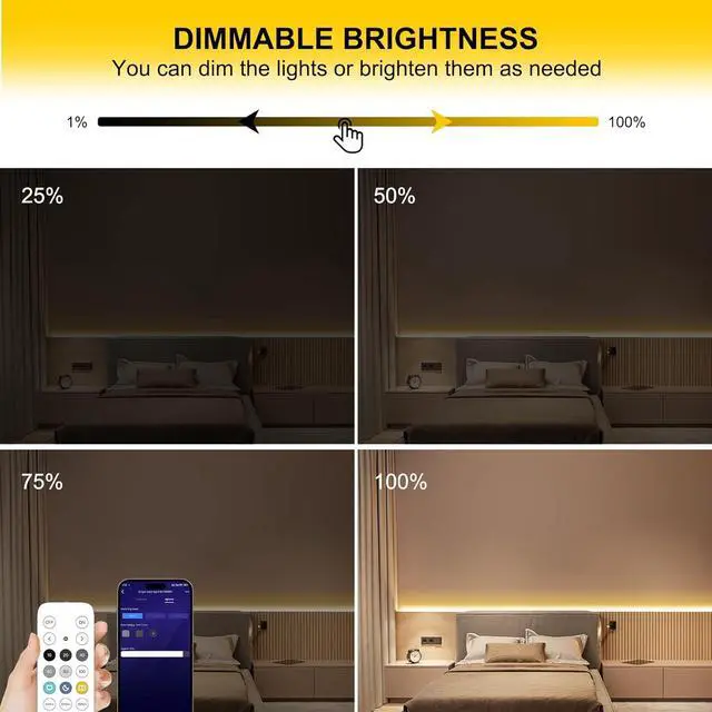 2. Lead-free material low voltage and safer Our COB LED light strip is made of lead-free materials which is safer for your health and the environment. Unlike traditional lead-containing materials this flexible COB LED light strip is more durable and environmentally friendly. It is powered by 24V low voltage eliminating the risk of electric shock and ensuring the safety of all users. In addition its low power consumption makes it an energy-saving COB LED light strip that is both efficient and affordable. 3. Dimmable and Smart ControlThis COB LED light strip with remote control can be controlled by mobile phone APP and the brightness can be adjusted between 0-100%.