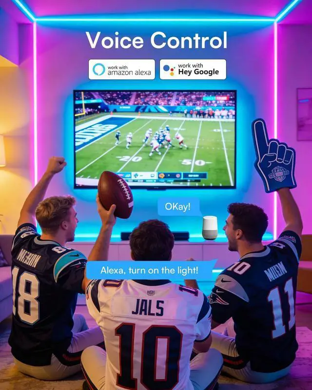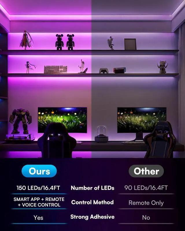 Hands-Free Voice Control: The smart LED strip lights are fully compatible with Alexa and Google Assistant. Simply use voice commands to turn lights on or off change colors or dim the brightness. Enjoy convenient hands-free lighting control for your smart home. Bright & Even Lighting with 150