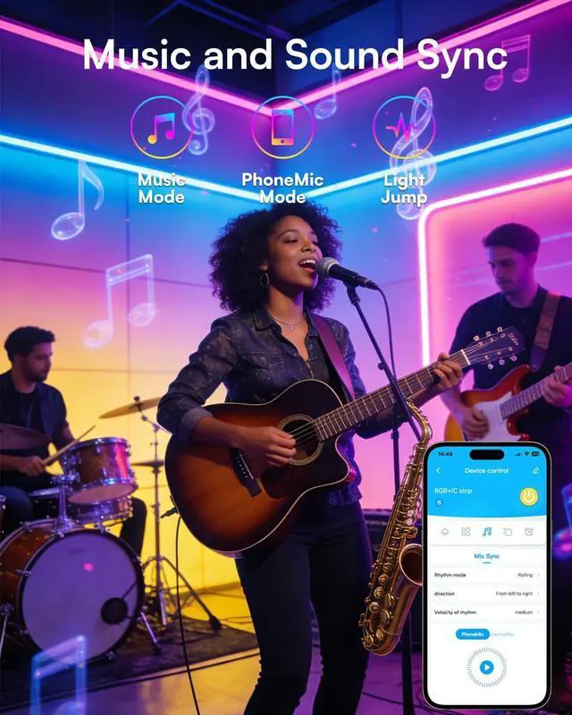 High-Quality LEDs: Equipped with premium 5050 LED beads this 16.4 ft LED strip delivers brighter and more uniform lighting than standard light strips. Create vibrant RGB lighting for your bedroom gaming desk TV backlight cabinets or shelves. Music Sync & 16 Million