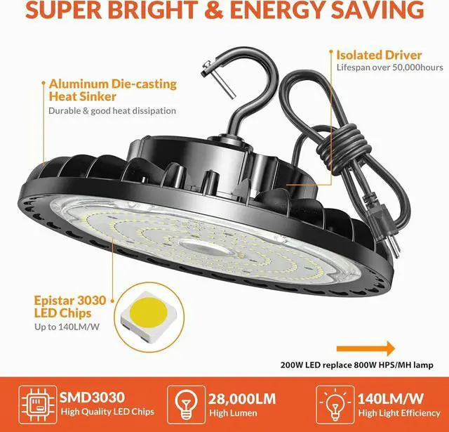 High Brightness & Bill Saving: This LED high bay light 200 watt features high quality SMD3030 LED chips; With Light efficiency up to 150 LM/W it outputs incredible 28000 LM; Its brightness equivalent to 800 W old led fixtures like HID/HPS and save your electric charge up to 80%. Large Beam Angle & 5000K