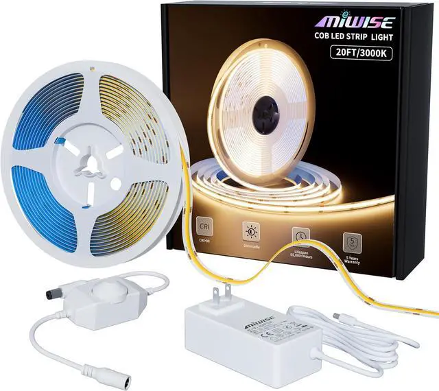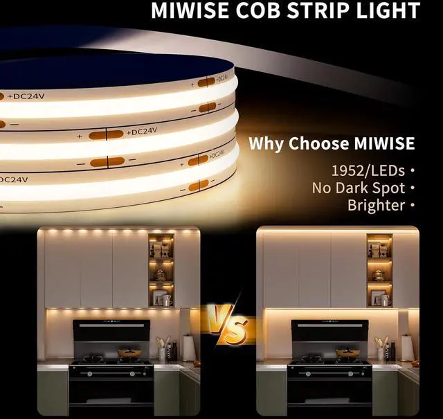 DC24V Professional Grade: MIWISE 24V COB LED strip light provides excellent lighting effects! Each 20-foot roll of strip lights has 1 952 LEDs providing illumination simultaneously making the LED strip lights appear to be continuous light. Unlike traditional SMD LED strip lights MIWISE COB LED strip lights have almost no dark spots and a 180-degree beam angle can provide a wider range of illumination. Professional-grade design elevates your installation project!