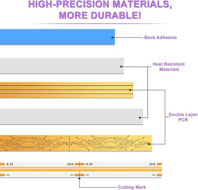 Wide Application: 24V COB LED strip lights are widely used. You can use these COB LED strip lights as supplementary lighting in dark areas to enhance the sense of hierarchy in your space! Therefore these upgraded LED strip lights are very practical for high-end business offices and can also be installed in kitchen cabinets bedrooms ceilings stairs dining bars 3D printers TVs etc.!