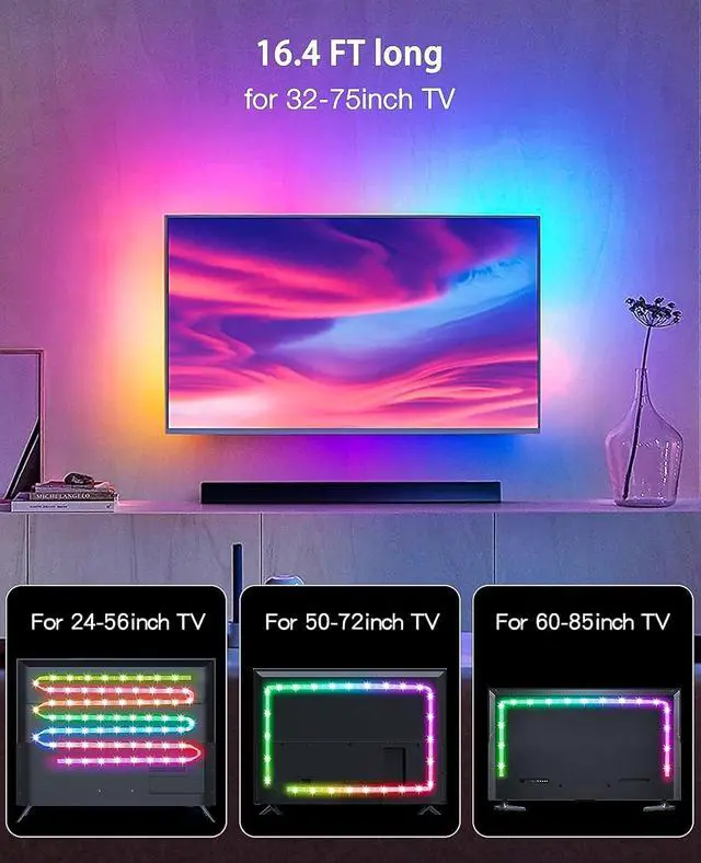 RGBICW Dream color Led Lights for TV TV led backlight Adopted RGBICW technology Individual colours can be used simultaneously in segments The light bar presents a rainbow-like (dreamy color) effect chasing effect running light effect etc. bringing you an extremely dynamic and immersive TV viewing/gaming experience. The voltage must be 5V too high a voltage may cause damage to the lamp beads If the brightness is not enough please use the usb charger power supply. Sync with MusicTV led backlight controller has a built-in high-sensitivity microphone open the microphone mode through the APP the LED Lights for TV will automatically change with the music beat or your voice Create a romantic atmosphere for you and your loved one.