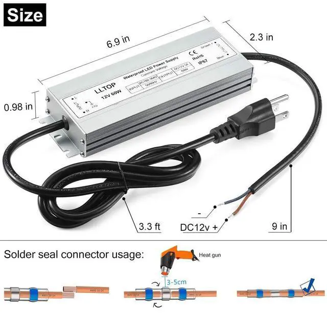 Output: DC12v 5A 60w 3.3 feet input cord with US standard 3-prong plug[Waterproof and