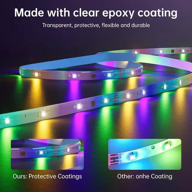 Three color change modes: jump gradient and strobe provide incomparable LED strips. You can also control the LED strip 32.8 ft with the included remote control. Music Synchronized LED StripThe LED strip 32.8 ft has a built-in sensitive microphone. The LED strip can detect the music in the cell phone and the surrounding sounds. The RGB LED light can change color brightness and rhythm according to the music or surrounding rhythm. LED string lights are the ideal accessory for parties. If you like to sing and play the LED strip also synchronizes the lights according to the surrounding sounds and makes your music colorful. Customizable Light Colors Multiple ModesLED Strip 32.8 ft use three primary colors each color has 255 digital values. By adjusting different color values you can get tens of millions of colors. In DIY mode the RGB LED Stripes can remember 1-6 colors so you don't need to set it up repeatedly. LED string lights 32.8 ft also have timing and brightness adjustment functions which makes them the best choice for bedroom decoration living room decoration and party decoration. Self-Adhesive LED Strip Installation in 1minThere is a strong adhesive tape on the back of the LED strip.