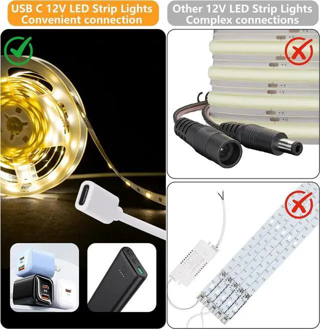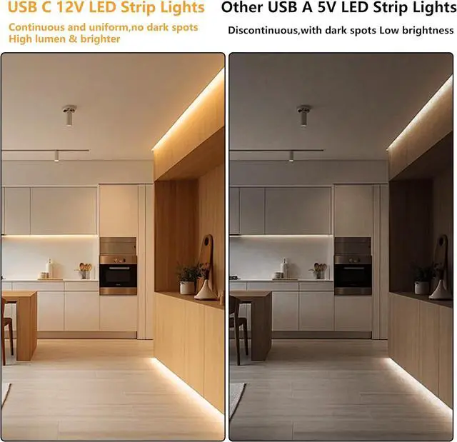 ?? POWERFUL 12V USB-CExperience superior 12V brightness via a modern Type-C interface. Strictly requires a 20W or higher PD power source to light up; standard 5V USB ports will not work.?? VERSATILE HOME AMBIANCEPerfect 3000K warm white glow for kitchen cabinets TV backlights and vanity mirrors. Provides a cozy consistent atmosphere across the entire 16.4 ft length.??? PEEL-AND-STICK SETUPFeatures an upgraded industrial-strength adhesive backing for zero-tool installation. Mounts securely to wood metal and plastic surfaces in seconds.?? FLEXIBLE DIY DESIGNEngineered with a highly flexible copper base that bends easily around 90-degree corners.