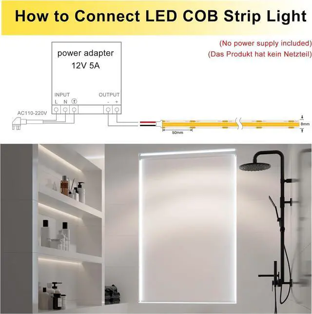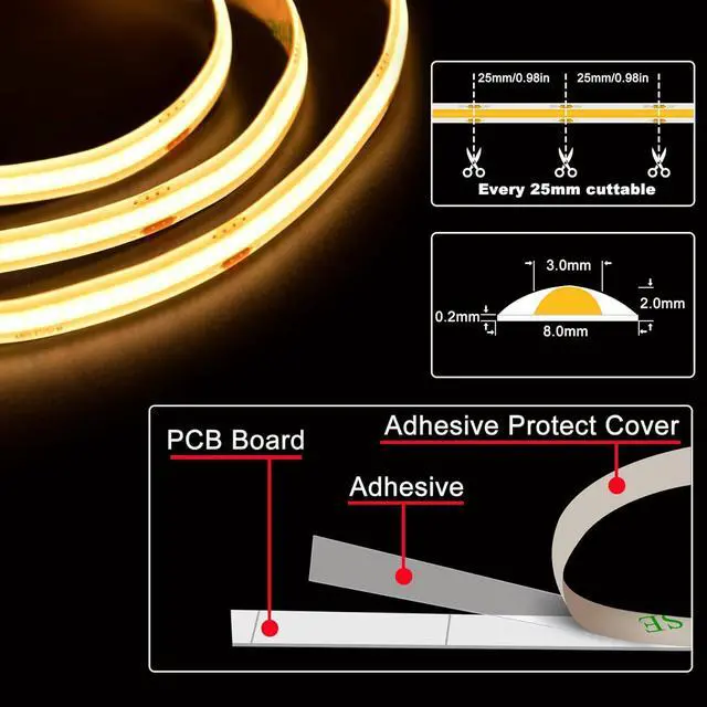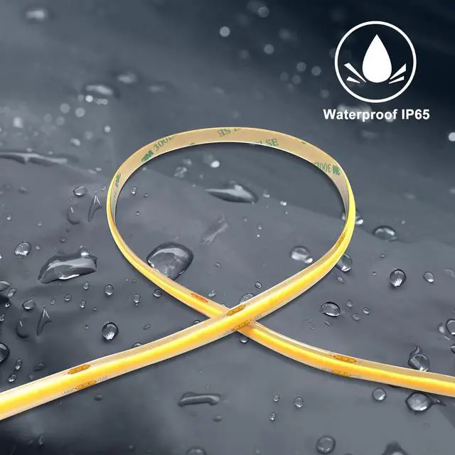 1. IP65 Waterproof RatingThis 16.4 ft COB LED light strip features 1600 LEDs creating an incredibly uniform lighting effect. With IP65 waterproof and dustproof properties it is also ideal for use in areas prone to splashes of water dust and grease such as bathrooms or kitchens (Note: not suitable for outdoor use)2. Highlight of COB Light StripLow power consumption higher luminous efficiency and a superior color rendering index (CRI 90+). The 180-degree beam angle design provides 50% wider illumination eliminating dark spots with even chip board illumination. 3. Safety and Easy CleaningThe surface of Padery IP65 COB LED light strip is protected with a layer of silicone preventing water from causing short circuits. With a low voltage of 24V safety is ensured at all times. The silicone protection makes cleaning easier a gentle wipe with a cloth can easily remove water droplets or dust. 4. Wide ApplicationWith a high color rendering index (CRI 90+) this COB LED light strip is perfect for high-end business clubs jewelry lighting cabinet lighting as well as providing bright illumination for dressing mirrors makeup tables wardrobes bookshelves wine cabinets and TV backlighting. 5. Easy InstallationFeaturing authentic 3M adhesive for reliable installationPlease make sure the surface is smooth dry and free of foreign matter before installation. this It can be easily cut along the marked lines providing convenience for DIY lighting projects. If you have any questions about using COB LED Strip Lights.