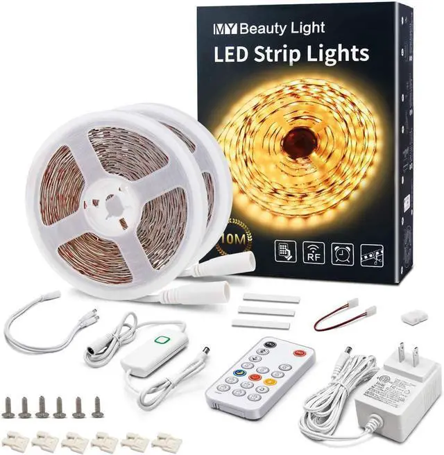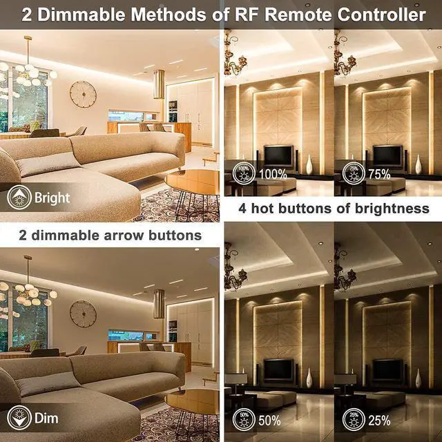 Controlling Methods: The led strip comes with a rf remote controller and a dimmer switch. You can use each of them to control light stripDimmable: Rf remote controller is with 10 degrees brightness adjustment and 4 hot buttons for brightness selection. Dimmer switch long press to adjust light brightness short press to turn on or off on-green light off-orange light5 Timing Modes and 2