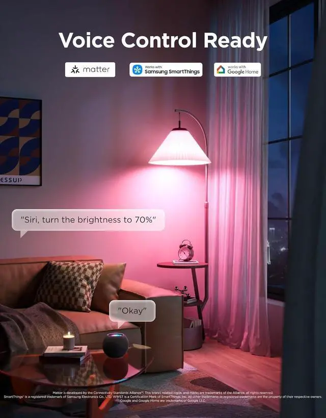 )Seamless Smart Control: Compatible with Alexa Google Assistant Matter and SmartThings for voice and app control. Automate your lighting with schedules and sunrise/sunset routines for a hands-free smart home experience.