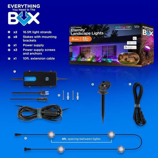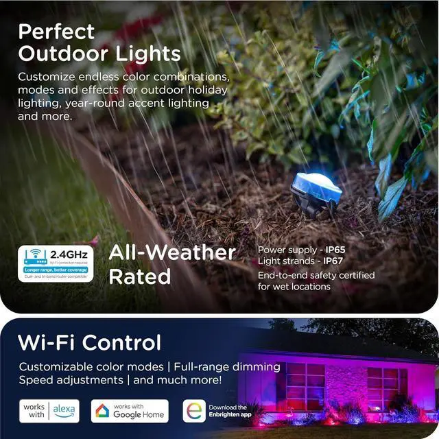 LIGHTING MEETS LIFESTYLE RGBWIC LEDs provide dedicated adjustable white light to perfectly match your homes exterior lighting and the full spectrum of true rich colorsALL-IN-ONE KIT Two 16.5 ft. black strands eight total LED pucks durable stakes power supply and 10ft. extension cable are included to enjoy straight out of the boxSMART APP Pair to your 2.4GH z Wi-Fi through the Enbrighten app to accentuate your home with millions of color combinations modes and effects plus schedules automations and individual LED control create unique outdoor holiday décor or accent lightingDIY INSTALLATION Simply snap the lights onto the stakes which secure in yards gardens flower beds and more and link strands to create the layout of your dreams; 150ft.