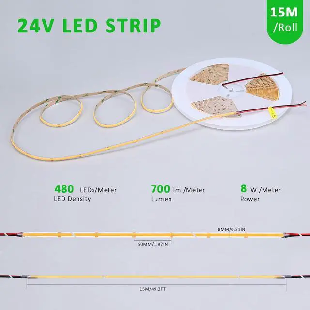 [ COB LED Strip Lights 49.2FT ]: 49.2FT per roll with 7200LEDs high density design the LED strip emits a bright and dotless lighting effect COB LED strip has a wider beam angle of 180 degree emits a wider and softer light than SMD[ Without