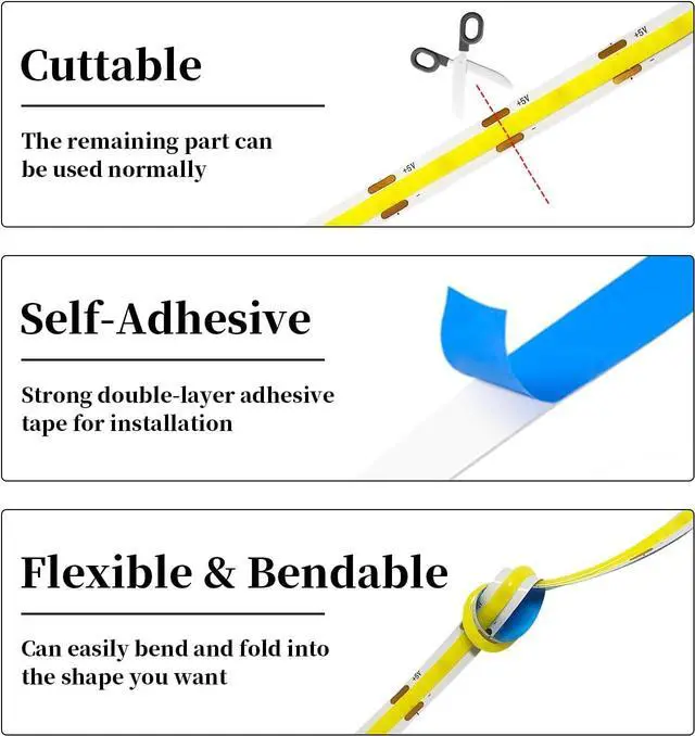 Connected it to any device such as a power bank mobile phone charger computer desktop laptop tablet TV etc. Durable & Easy to InstallThis usb led light strip is cuttable and cuts along the solder joints mar which providing you with more creative freedom during the installation process real double-layer thick copper on pcb board for durable daily use authentic self-adhesive for stronger stick on clean/dry/smooth surface. flexible and cuttable design allows you to bend the cob light strip into your DIY shape. Safe to UseThis usb operated cob led strip light works with 5V low voltage energy saving touchable child and pet safe.