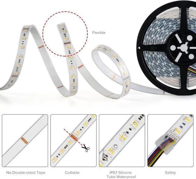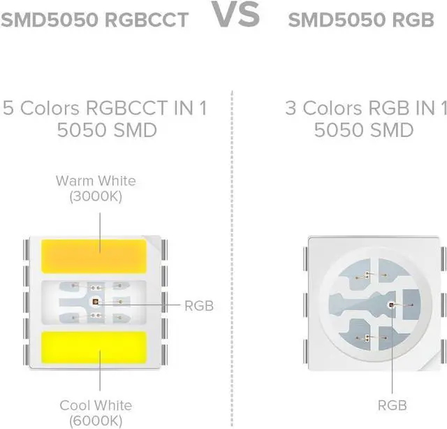 New Arrival R G Bwarm white cool white 5 colors mixed in 1 LED. RGBCCT RGBWW RGB+CCT light strip offering super bright glowing and vivid color. 300RGB LEDs+3000 Warm White LEDs+300 Cool White LEDs 60LED/m 16.4 ft. Cool white 6500K Warm white 2700K. Tunable Color Temperature. Warm white and cool white will blend into 2700K-6500K white lightAmazing Mixed color in SMD producing multi wonderful colors. 5 colors(RGB+CCT) can be mixed into 16 million different colors+2700K-6500K White light. Advantages of