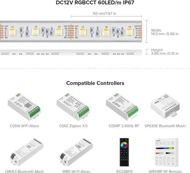 IP30 IP65 FPCB width: 12mm. IP67 silicone sleeve width 14mm. It can be cutted every 3 LED so you can adjust them to the right length. 6 PIN connectors on two ends can connect LED strips in series easily. Latest LED technology new experience LED life. Work with Smart RGBCCT Controller you can voice control your strip lights by Alexa/Goole Home/IFTTT; just a simple voice instruction to control lights; Control the light color changing Brightness light mode through your phone APP anytime and anywhere. WiFi Alxa Tuya Smartlife APP controller: B08L9GWJK1 Zigebee 3.0