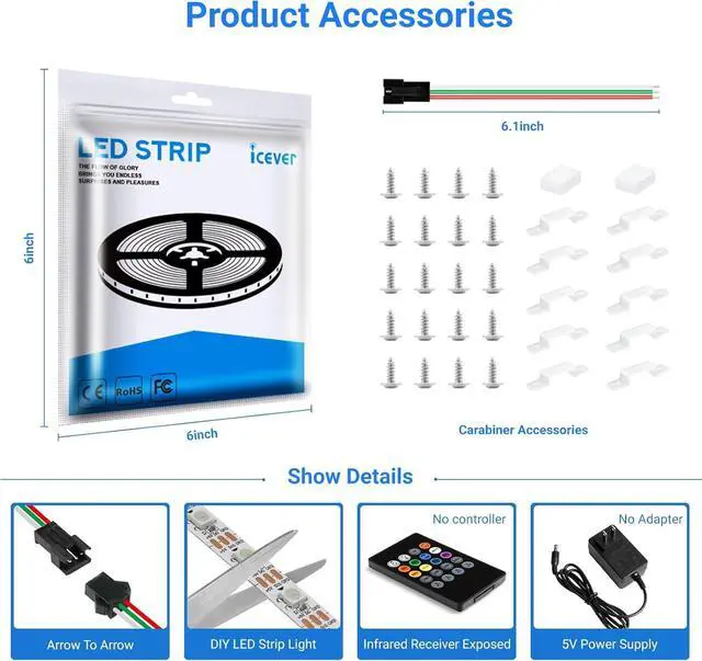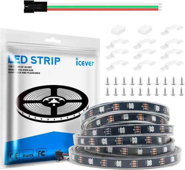 ?? Individually Addressable Full Color & Brilliant LED Strip LightsIcever's WS2812B LED strip lights are a dream come true for every decor enthusiast. Equipped with an in-built WS2812B IC in 5050SMD these lights offer static chasing and various special lighting effects. Experience the vibrancy of a 256 brightness display and 24-bit color display.?? Effortless Installation & CustomizationIntroducing an RGB Led Strip Lights that's super easy to install and customize! Our LED light strip are designed with 3pin connectors and separate power/ground wires at both ends for a smooth hassle-free setup. What's more every LED can be individually cut-off without damaging the rest of the strip giving you the freedom to create your unique light setup.