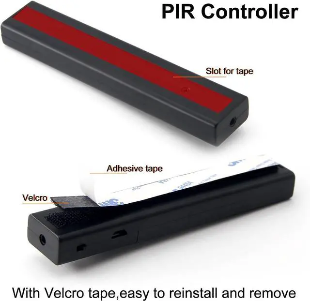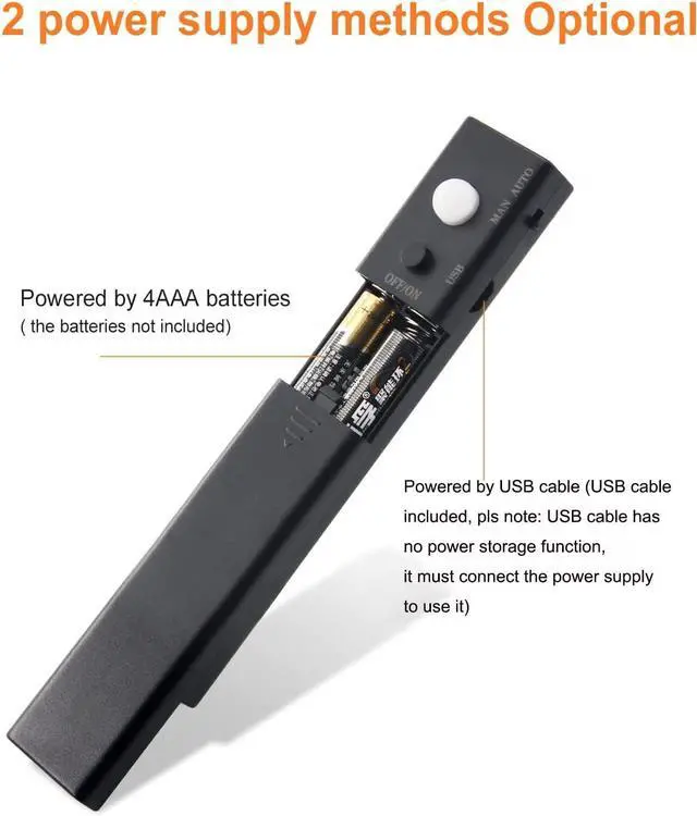 m sensing time: 30s). In Man position it runs by the ON/OFF you need to press the button by yourself. 2 Power Supply Methods2 power supply methods 4 AAA batteries (Not included) or USB cable. Velcro Tape InstallationEasy and convenient. Use velcro tape for installation which can be reinstalled and removed freely. The LED strip with 3M adhesive tape allowed you to quickly install wherever you need extra light. Wide ApplicationThis product is ideal for stair tent bookshelf baby room bedroom kitchen garage basement closet hallways entrance pantry trunk etc. High Quality Strip LightWith high-quality CE standard LED strip light high lumen high CRI good color consistency thickened design of FPC circuit board can carry more current.