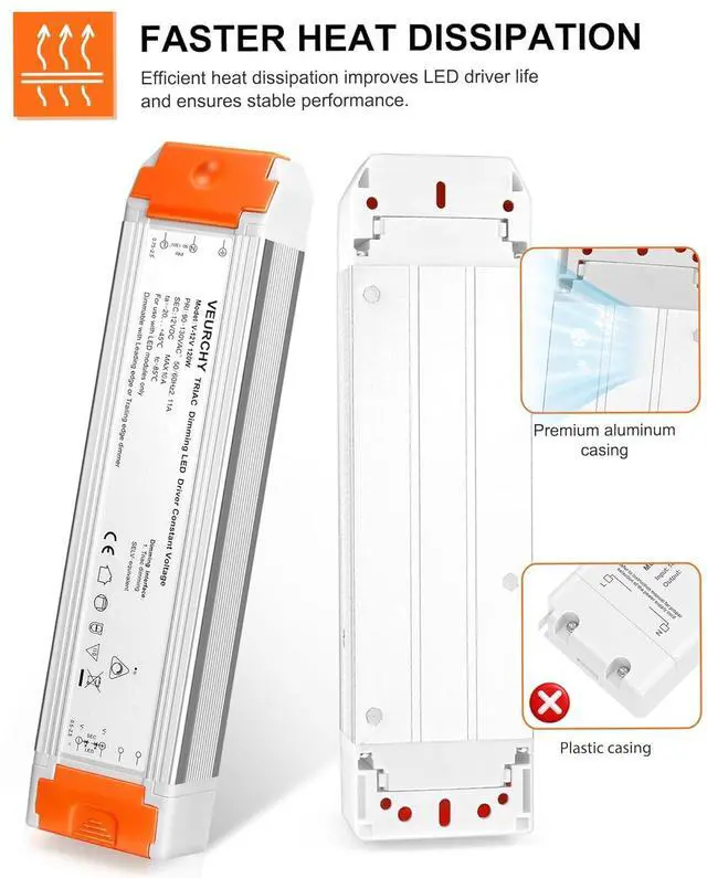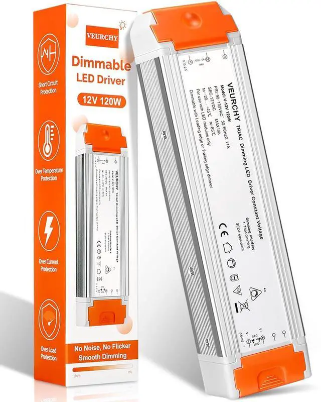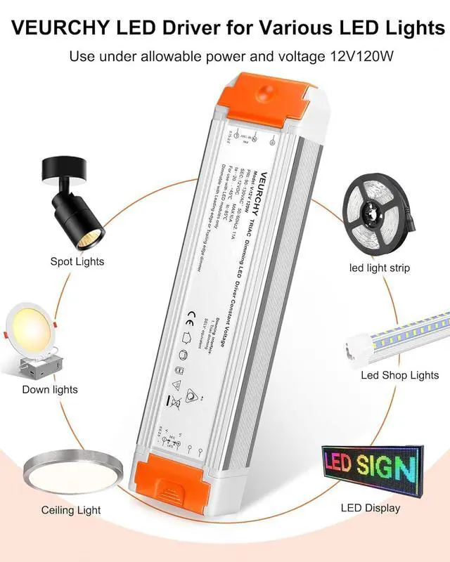 Strong compatibility and widely use: The VEURCHY 120W 12v dimmable led driver is compatible with Lutron & Leviton Switches ensuring easy integration into your home or office lighting. Suitable for various 12V LED lighting applications and under cabinet lighting such as led strip lights light bulbs pendant lights ceiling lights and linear lightsEasy to install: This dimmable 12 volt LED transformer is an ideal choice for DIY enthusiasts and professionals. Input and output with orange isolation waterproof and dustproof protection.