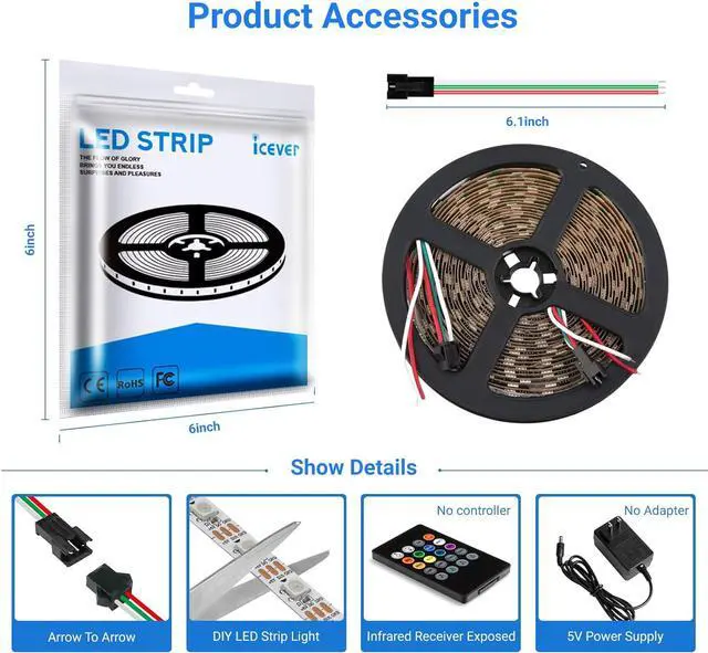 ?? Individually Addressable Full Color & Brilliant LED Strip LightsIcever's WS2812B LED strip lights are a dream come true for every decor enthusiast. Equipped with an in-built WS2812B IC in 5050SMD these lights offer static chasing and various special lighting effects. Experience the vibrancy of a 256 brightness display and 24-bit color display.?? Effortless Installation & CustomizationIntroducing an RGB Led Strip Lights that's super easy to install and customize! Our LED light strip are designed with 3pin connectors and separate power/ground wires at both ends for a smooth hassle-free setup. What's more every LED can be individually cut-off without damaging the rest of the strip giving you the freedom to create your unique light setup.