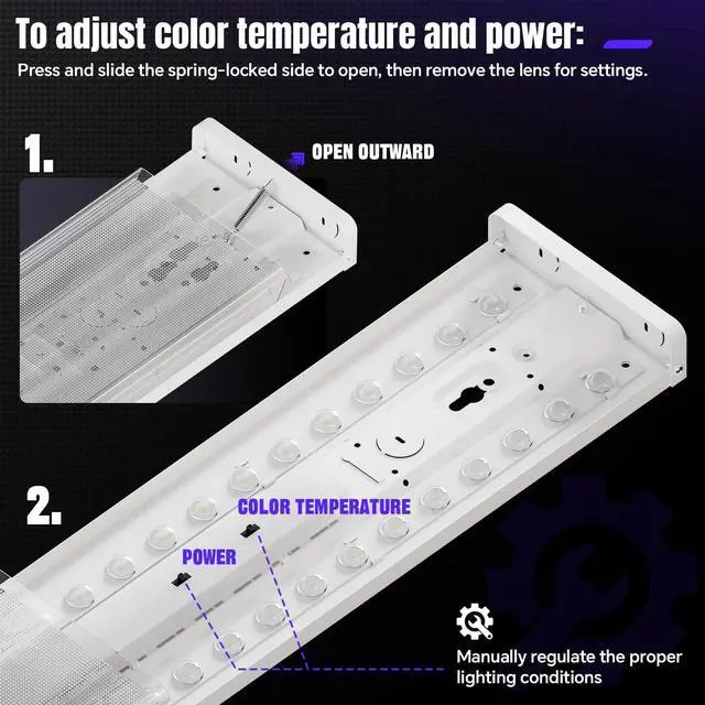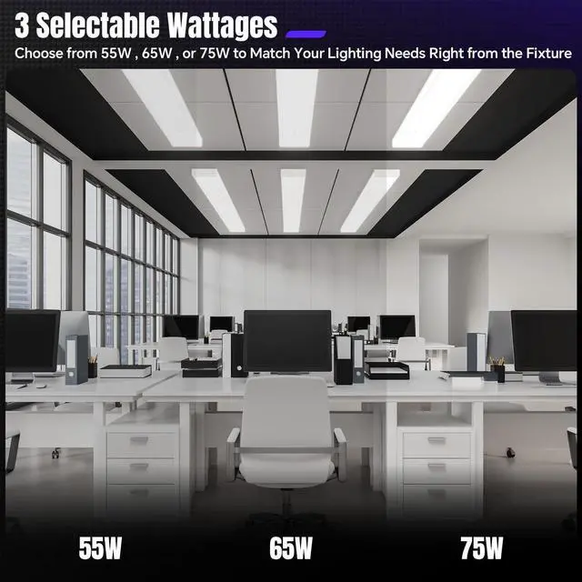 3 WATTAGES SELECTABLE - The 4ft LED wraparound light is a better design than the normal 4ft light fixture. Our LED wraparound light has a 3-watt switch which offers the ability to go from 75 watts 65 watts or 55 watts of power. With each adjustment the amount of light output will also change. The 75W setting will offer 8250 lumens 65W offers 7150 lumens and 55W offers 6050 lumens. VERSATILE USE- Our 4-foot LED wraparound light can be easily mounted on ceilings making it ideal for various spaces such as office shop garages workshop workbench kitchen laundry closet utility rooms storage rooms basement barn school meeting room hallways stairwells warehouse equipment rooms auto shops and replacing fluorescent light versions.