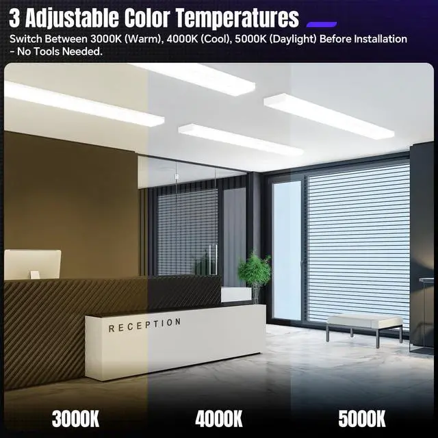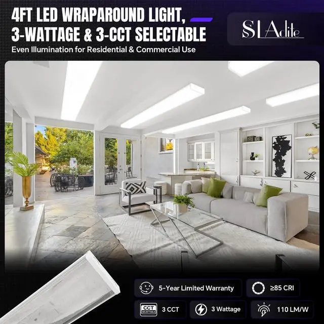 It is suitable for use in both residential and commercial settings. 3 CCT SELECTABLE- Our 4ft LED light fixture offers the option to choose between three different color temperatures - 3000K 4000K and 5000K. You can easily switch between these options before installing the fixture on your ceiling allowing you to select the desired lighting ambiance from warm to cool daylight-like tones. EASY INSTALLATION- Just refer to our guide for a fast and simple setup using the provided mounting hardware. Attach the light directly to the ceiling using a junction box for immediate illumination. BUY WITH CONFIDENCE Our well-built 4ft wraparound light with 50 000h lifespan meets higher safety and quality standards and has ETL certification.