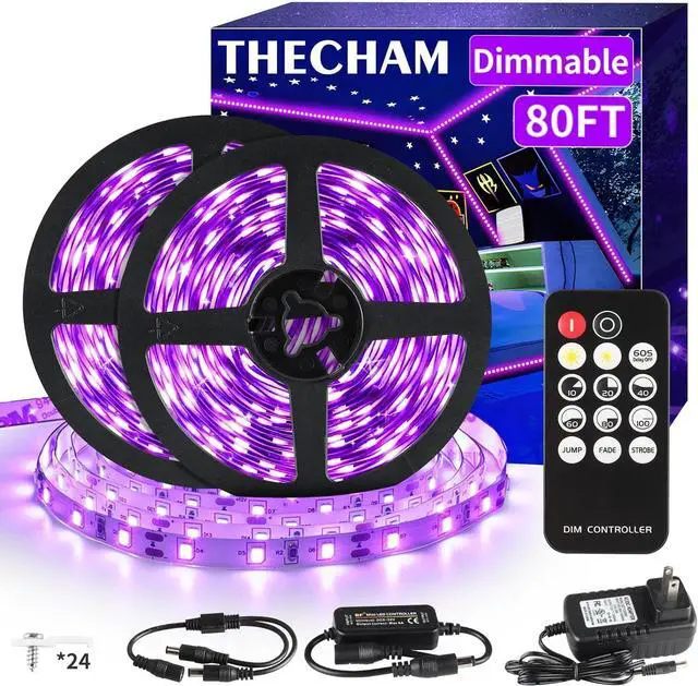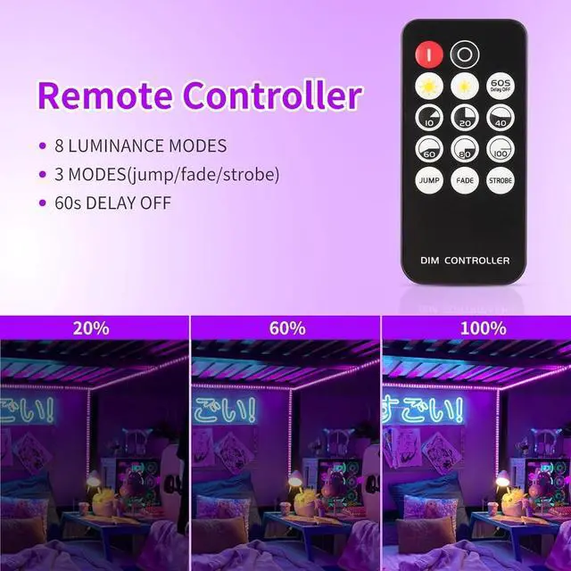 REMOTE CONTROL: THECHAM black light strips with remote provides 3 functions. 1. Adjust the brightness of the light by percentage 10%/20%/40%/60%/80%/100%. 2. Provide 3 lighting modes (jumping fading blinking)