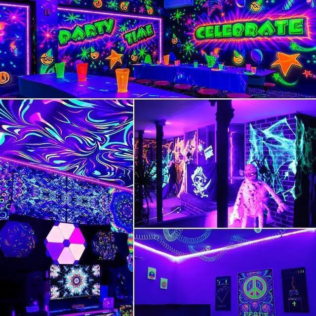 Application Scenarios: Black light can make fluorescent dyes fluorescent products body painting more obvious often used for fluorescent party indoor decoration. You can make your unique fluorescent fashion design with THECHAM high quality black light products