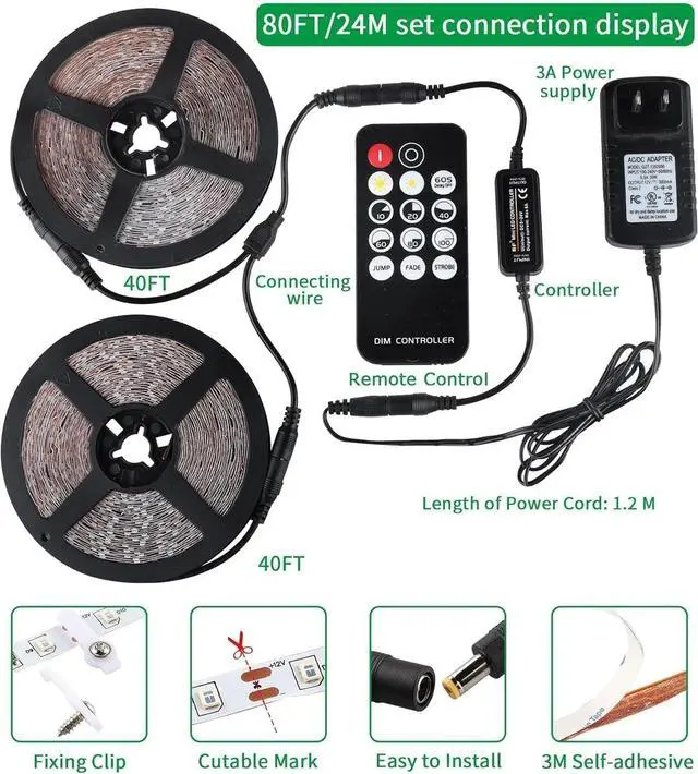 BLACK LIGHT STRIP: This 80FT blacklight has 1440pcs high quality LEDs featuring high brightness and energy efficiency. The 2*12M black light strip includes accessories: fixing screws switch adapter remote controlSAFE