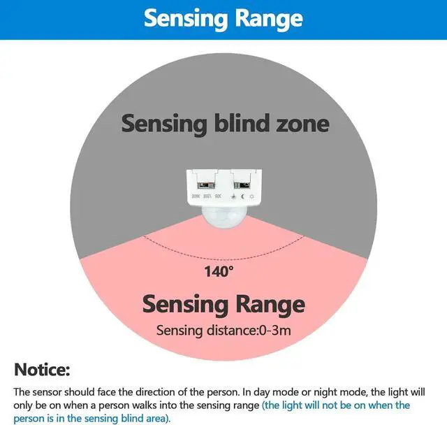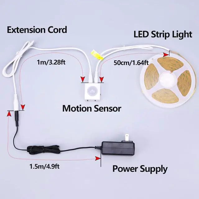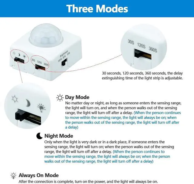 Multiple Modes3 lighting modes: sun mode moon mode constant light mode; 3 delayed off time: 30 seconds 120 seconds 360 seconds; 3 brightness modes: 10% 30% 100%. CuttableThe light strip can be cut every 2.5 cm along the cutting marks perfect for easy DIY. Warm ReminderWhen installing the motion sensor should point in the direction of the person. In sun mode and moon mode the light will only turn on when a person enters the sensing area. (When the person is in the blind spot the light will not turn on). When the motion sensor is facing a heat-generating object or animal the motion sensor will be triggered by mistake. Widely UsedWidely used in entry doors stairs kitchens cabinets beds and other places.