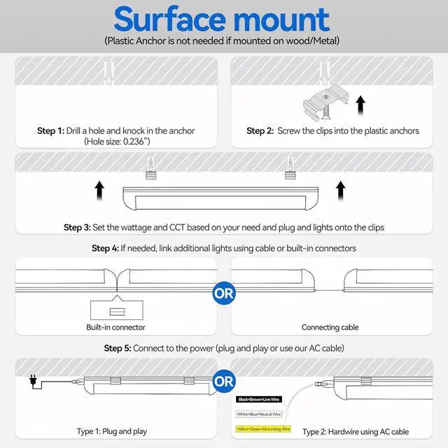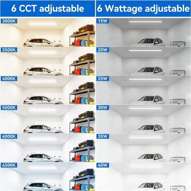 6 Wattage & 6 CCT Adjustable Our LED shop light fixtures feature adjustable wattage: 15W-20W-25W-30W-35W-40W (6 levels of brightness) and tunable color temperature: 3000K-3500k-4000k-5000k-6000k-6500K (6 levels of CCT) making it versatile for any indoor applications and environments! Super Bright But Doesn't Glare Each our super bright 4ft LED shop lights delivers up to 5 600 lumens at 40W. Despite its brightness our frosted cover/lens doesnt glare and ensures comfortable lighting without hurting the eyes. Link Up to 17 Units Unlike most shop lights that only link 34 units our 4FT LED shop lights can be daisy-chained up to 700W (17 units for 4 footers) simplifying connection installation and reducing wiring time and effort. Silent & Eco-Friendly No buzzing no flickering and no harmful emissions. Our lights are 100% Safe free of UV IR and hazardous materialsensuring a quiet and eco-friendly operation making them perfect led ceiling lights for garages workshops warehouses workbenches basements barns utility rooms storage sheds under-cabinets etc. Complete Accessories with