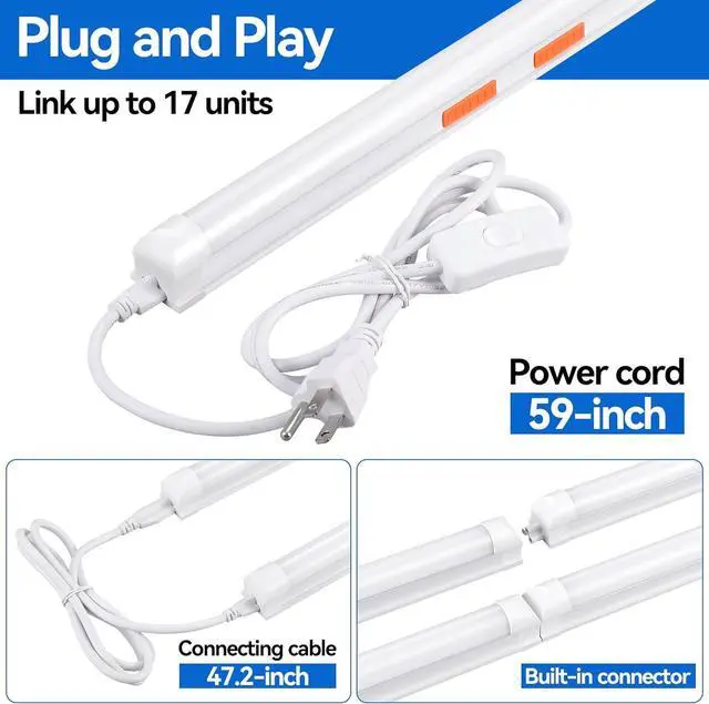 Extended Cables Each package includes: 6× LED shop light fixtures 3× 59-inch power cords with on/off switch 6× 12-inch hardwire cables 5× 47.2 -inch connecting cables and 6× surface mount accessory kits everything you need for a hassle-free setup!