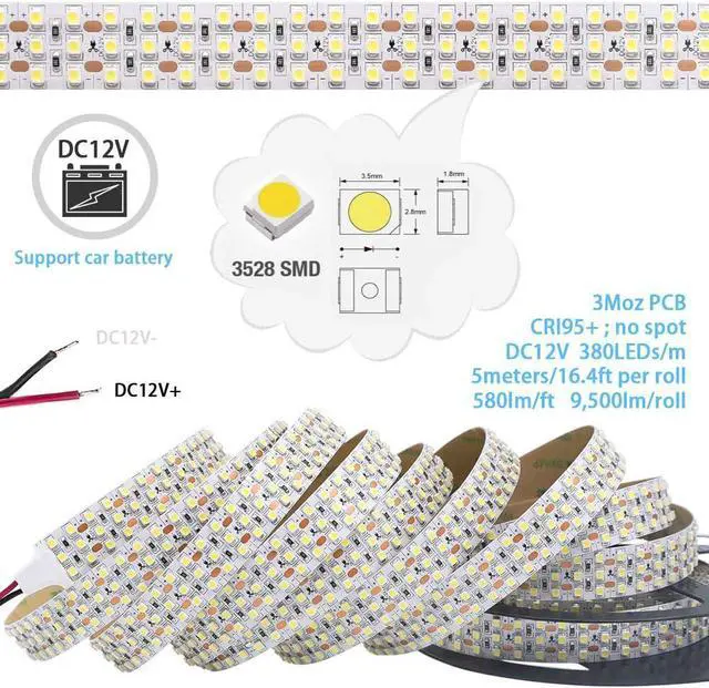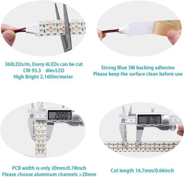 Cuttable and LinkableThe DC12V 16.4 ft/5m high CRI LED strip 6000K every 6 LEDs can be cut along the cutting marks easily get various lengths you require for LED lighting projects. After cutting the 95 CRI LED strips you can also re-connect or solder these high-output LED strips as you want. Easy to InstallWith 3 Moz Flexible FPCB board it is easier to bend for different installation needs. Peel off the adhesive backing tape on the back of the 95+ high color rendering index light strips you can stick this full spectrum white LED tape lights to anywhere you want.