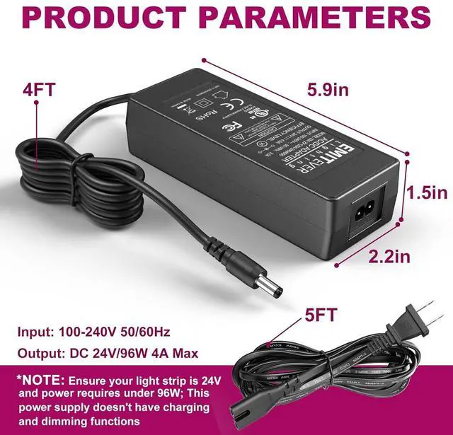 NOTE: Ensure your device operates at 24V and requires under 96W to avoid issues like not lighting flickering over-heating etc; This power supply doesn't have charging and dimming functions; For dimming use an external PWM controller at the DC endSPECIFICATION? 100-240V AC 50/60Hz input; 24Volt DC constant voltage output 96 watts 4A max; Start up time can take from 1-3 seconds in order to stabilize output and extend the life of the power supplyWIDE