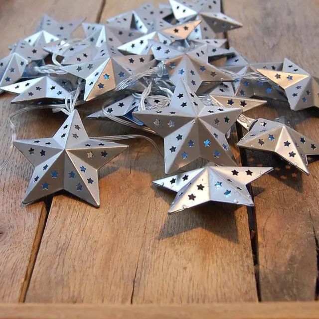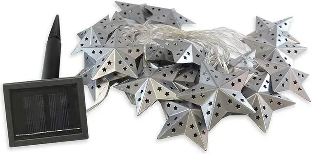 Solar powered string lights with silver metal stars add a festive touch to your outdoor decor. The cool white LED lights shine through the stars' design opening creating an eye catching glow. Their lovely illumination adds perfect accent lighting to a patio, porch, deck, garden, tree or entry way. Charged by the sun, they can be place anywhere outdoors with no extension cord needed. These lights will highlight your outdoor decor from dusk until dawn.