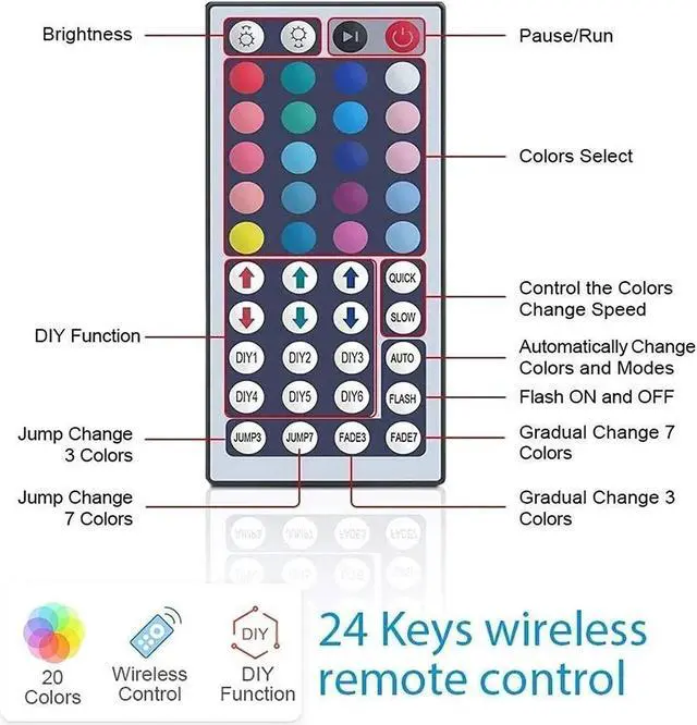 Multiple Choices LED Strip Light: This RGB Led strip lights kit can change colors and speed automatically and periodically. It has not only RGB(Red, Green, Blue), 20 multicolored options, but also has DIY selection to create your great led mood lighting.
