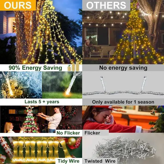Copper wire LED+PVC materialOur christmas tree lights are made of high quality copper wire and durable PVC. Compared with other LED Christmas lights, it is characterized by very safe power, bright beads, long continuous lighting time and power saving, as well as IP44 waterproof and not easy to damage, very good quality. Christmas Decorations Star Light is a wise choice for your essential Christmas decoration.