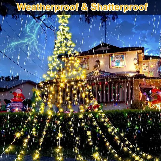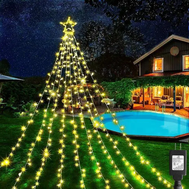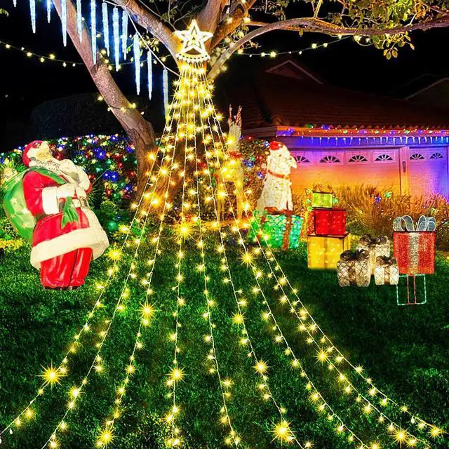 350 LED Christmas Lights The outdoor Christmas star lights have 350 LEDs, topped by 1 large star, connected with 9 long strings of light beads. The design is shaped like a sprinkling waterfall with a dazzling of stars. You can decorate the Christmas light outdoors or indoors to create a romantic atmosphere. The Christmas light can accompany you and your family and neighbors to spend a happy Christmas.