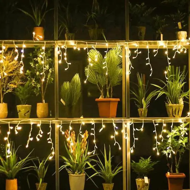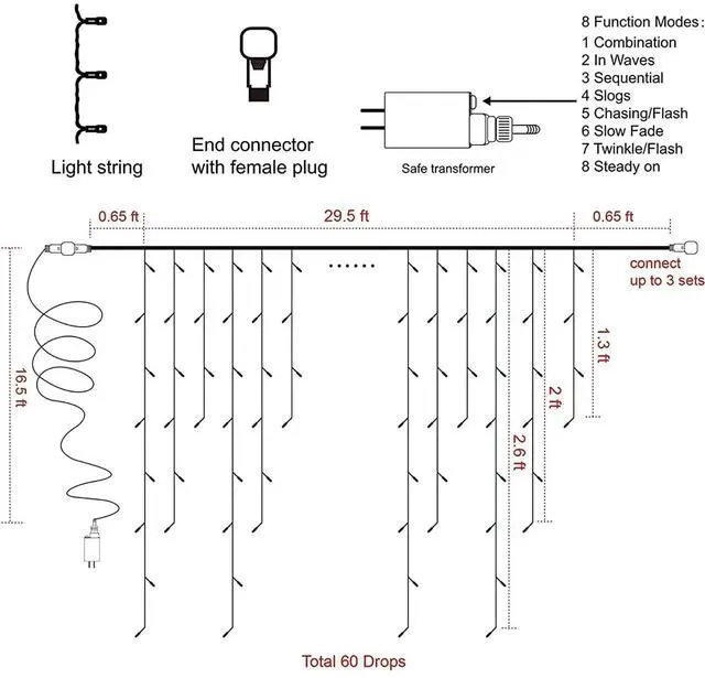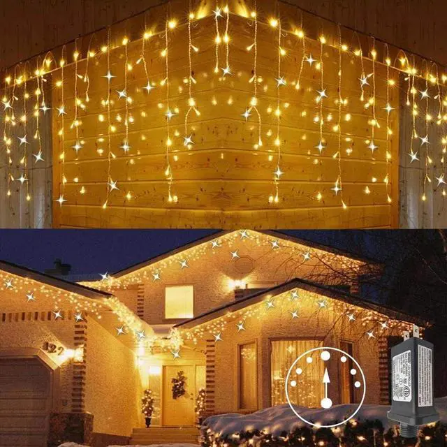 Color Warm WhiteIndoor/Outdoor Usage OutdoorSpecial Feature christmasLight Source Type LEDPower Source AC/DCLight Color Warm WhiteTheme ChristmasOccasion Wedding, ChristmasStyle christmas About this item8 Modes with Memory Function This Christmas icicle lights have 8 different modes: Combination, In waves, Sequential, Slogs, Chasing/Flash, Slow fade, Twinkle/Flash and Steady on. The Christmas fairy lights have a memory function, which could recover from the previous setting mode when you restart. Different modes represent different moods and no need to reset mode every day(Note The memory function is only work in the event of power, if plug out, the memory will disappear)Super Bright Christmas Lights 360 Super bright lights with 60 Drops, light length 29.5ft, lead cable 16.4ft, the last bulb in each drop is wrapped by an ice cone, which make the icicle lights more-sturdy. Our icicle string lights end to end connectable, connect up to 3 sets (Total:88.5ft)Safe to Use & Easy to Install The output voltage of the icicle Christmas decorations lights is 30V and plug have been certified by UL to ensure & maximize the safety. Step1-Place or hang the icicle string lights on any other occasions in seconds to finish your decoration. Step2-Plug the transformer into the main supply and power the Christmas twinkle lights on, then you can choose the mode by the button on the power adapterWaterproof & Timer Function The icicle fairy twinkle lights and the plug are waterproof designed which make it perfect for both indoors and outdoor decorations ( The power adapter is not waterproof, should be used with waterproof receptacle cover when used outdoor).Our icicle lights also have timing function, which automatically turns on for 6 hours and turns off for 18 hoursWidely Application Our icicle fairy string light is a great decoration for Christmas party, holiday, wedding, party, home and garden lights. SpecificationLED Qty: 360, total 60 drops, 60 ice coneLight Length: 29.5ftLead Cable: 16.4ftVoltage-input: AC 120V-50/60 HzVoltage-output: DC 30 VWaterproof Rating: IP44With timer & memory functionConnectable, max 3 strandsYou Will Get1 x 360 LED Christmas Icicle Lights1 x Power Adapter1 x Manual