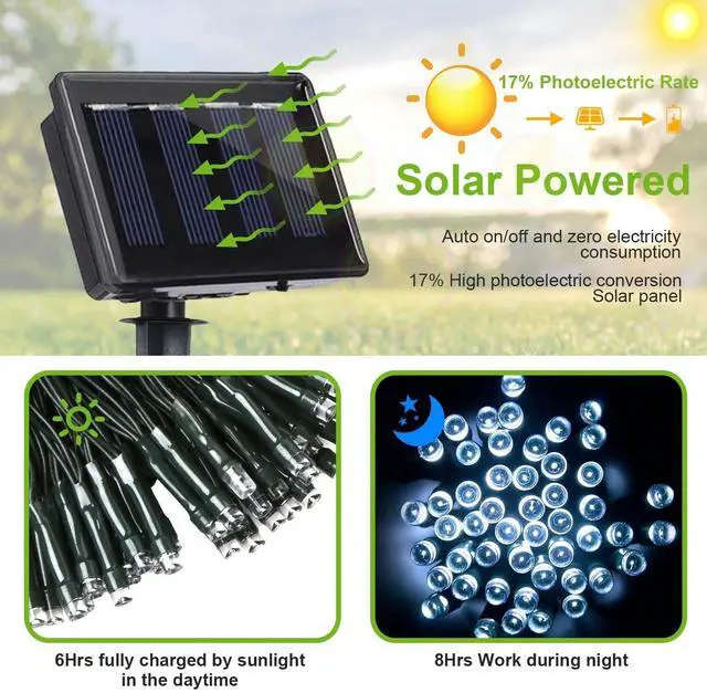2. *Cost-saving Solar Powered:Power supplied by solar energy,no extra electricity cost. Adopting high-grade polysilicon solar panel with 180°angle adjustable design and built-in 800mAh Ni-MH battery,after approx. 8-12hrs charging,our string light can work about 8hrs in steady-on mode and about 15hrs in flash mode.