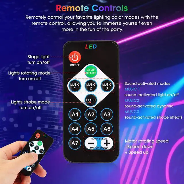 Command the party vibe without moving an inch! The included remote puts you in total control. Instantly switch between the 7 dazzling color modes, activate the thrilling strobe effect, or set the lights to pulse to your music's beat. Simply dial in the perfect mood by controlling the spin speed—from a relaxed, rhythmic pulse to an energetic whirl that keeps the party energy high.