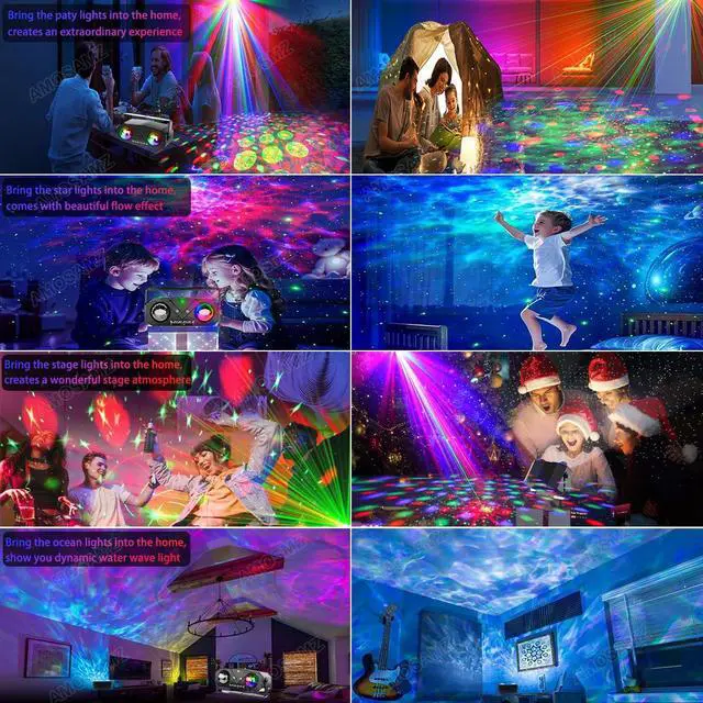 Newly Upgraded 5-in-1 Light ProjectorParty light projector combines a magical RGB disco ball, ocean light, red laser light show, green laser light show and star light all in one device.Features multiple vibrant colors that project shining stars,memorizing nebula cloud, beautiful light pattern show and romatic water wave light.Bring multi-scene party lights into the room, where you can enjoy the excitement of the party and appreciate the beauty of space