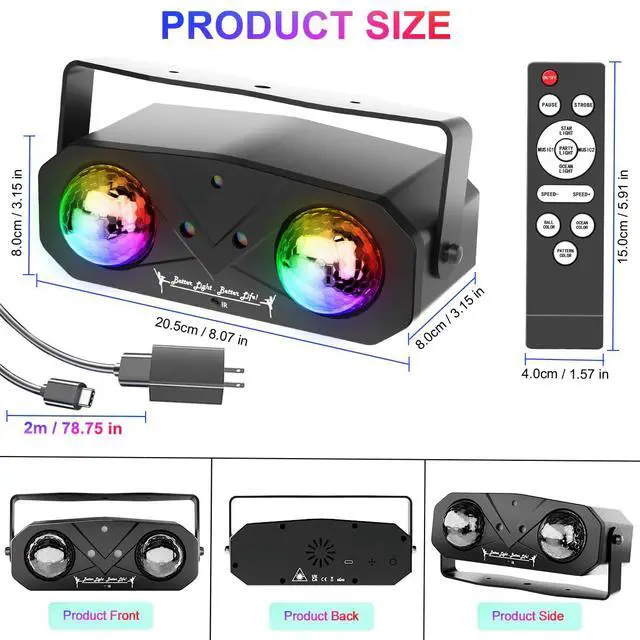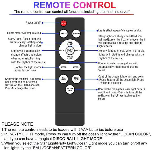 Multiple Lighting Scene Choice1) Party Light Mode: Party lights consist of 7 LED RGB disco ball, starry light, ocean lights and various red and green laser light pattern.It will bring a new party effect and give you an unforgettable experience.2)Star Light Mode:LED RGB ocean light and stars, multiple color mix for your choice, project the star projector onto the wall or ceiling, comes with beautiful flow effect. 3)Ocean Light Mode:Ocean light will show you dynamic water wave light, showing you a more contagious effect.4)Disco Ball Light Mode:Magical RGB LED disco ball+red&green light pattern, creating a more wonderful stage atmosphere with multi-effect