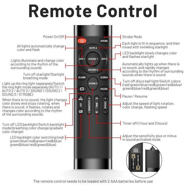 Easy Operation: Simple plug-and-play setup with a remote control for easy adjustment of light modes, sound activated sensitivity, light color, speed, and a timer that you can set to turn off after 1 hour and 3 hours.